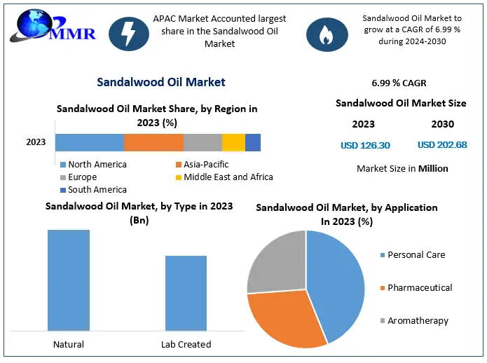 The Sandalwood Oil Market Share was valued at USD 126.30 Million in 2023 and is expected to reach USD 202.68 Million by 2030, exhibiting a compound annual growth rate (CAGR) of 6.99% during the forecast period (2024-2030).Sandalwood oil, an essential oil extracted from the heartwood of sandalwood trees, is renowned for its distinctive woody aroma and therapeutic properties. It has been utilized for centuries in traditional medicine, religious rituals, and as a fragrance component in personal care products.