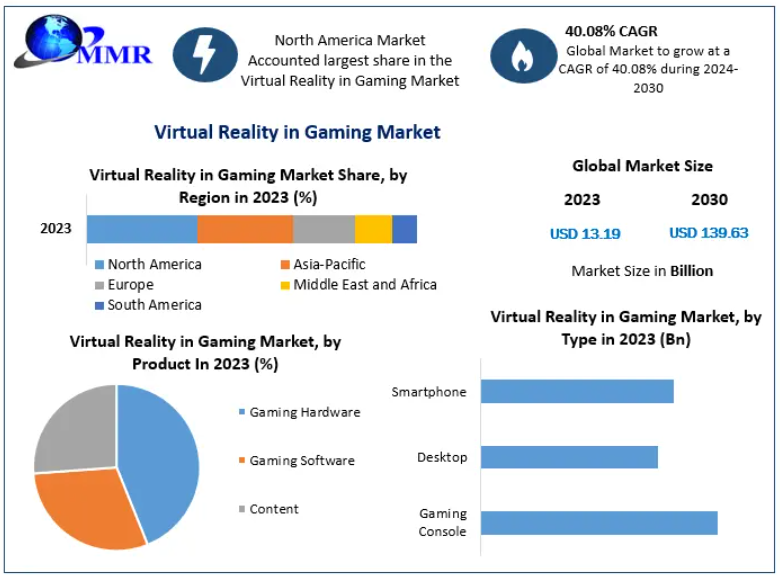 Virtual Reality in Gaming Market was valued US$ 13.19 Bn. in 2023 and is expected to reach US$ 139.63 Bn by 2030, at a CAGR of 40.08 % during a forecast period.