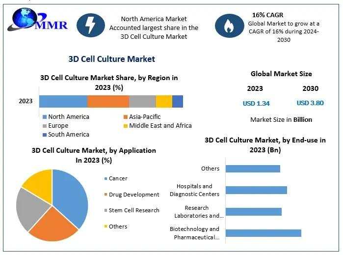 The 3D Cell Culture Market Growth is experiencing significant growth, with projections indicating an increase from USD 1.34 billion in 2023 to USD 3.80 billion by 2030. This expansion, representing a compound annual growth rate (CAGR) of 16%, underscores the transformative impact of 3D cell culture technologies in biomedical research and drug development.