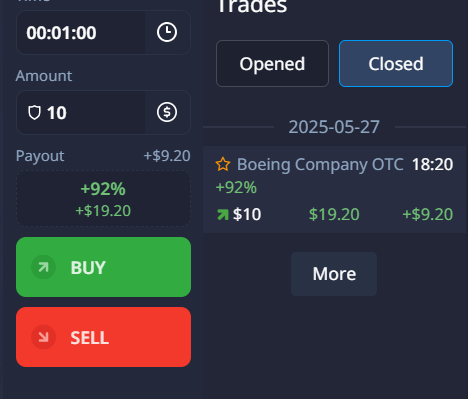 92% payout on a practice trade? Building that confidence! A successful practice trade on a trading platform, showing a 92% payout on a Boeing Company OTC trade. It highlights the potential for gains in a simulated environment. #TradingPractice #ForexTrading #IQOption #DayTrading #InvestmentJourney #PracticeMakesPerfect #ProfitGoals #FinancialLiteracy #SimulatedTrading #BeginnerTrader